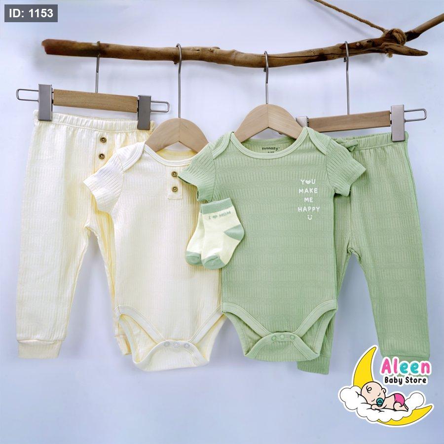 طقم قطني ناعم مصنوع من قطن 100٪ طبيعي، لطيف جداً على بشرة المولود الحساسة وما بيسبب تحسس أو تهيّج 💛