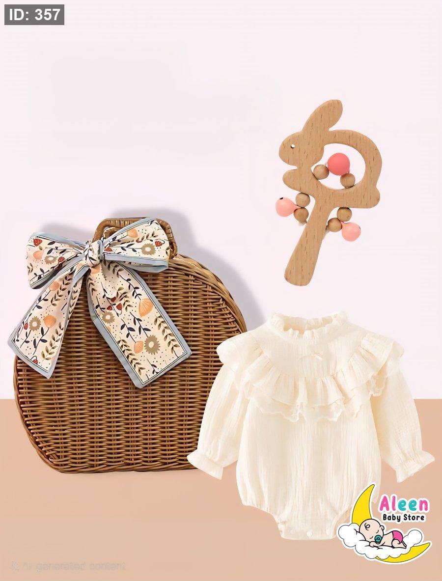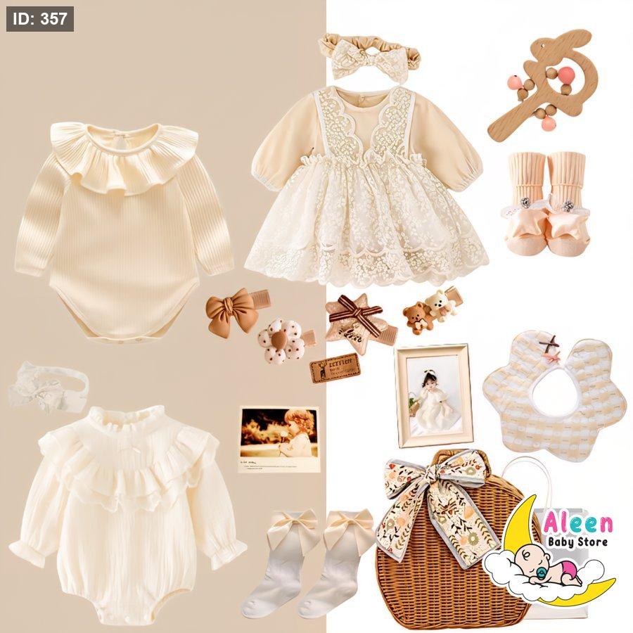 طقم بنتي راقٍ جداً بدرجات البيج والكريمي، مثالي لاستقبال المولودة، تصوير النيو بورن، أو كهدية جاهزة. الخامات ناعمة، مريحة، والتفاصيل أنثوية فاخرة من الدانتيل والشراريب والفيونكات.