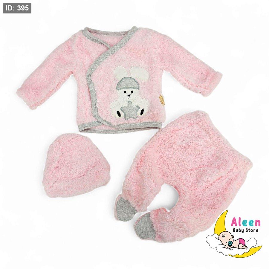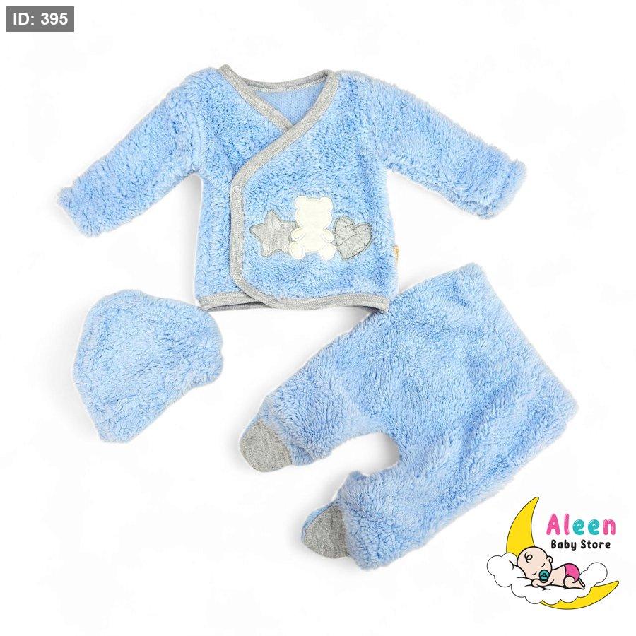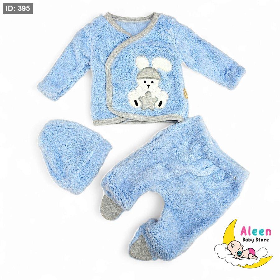 هاي البجامة الشتوية للمواليد ناعمة ودافئة، بلوزة وبنطلون وطاقية فرو بملمس خرافي عالجلد 💕
