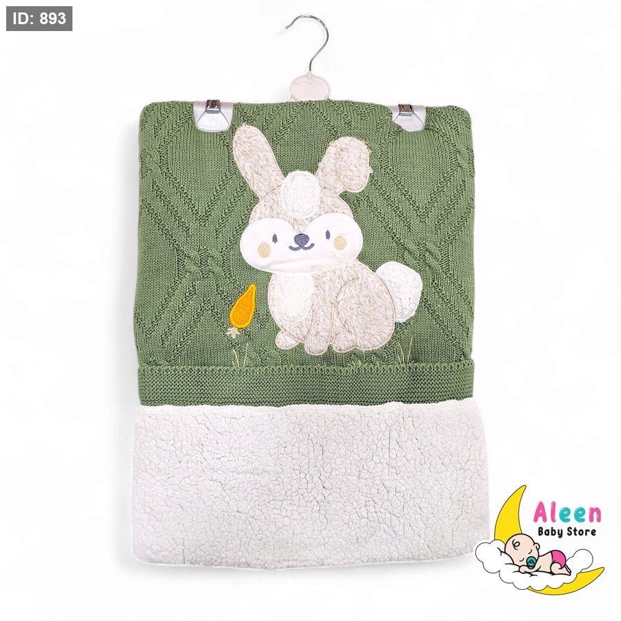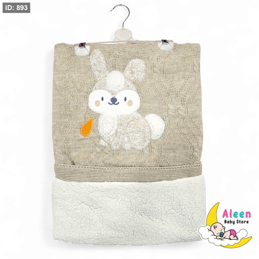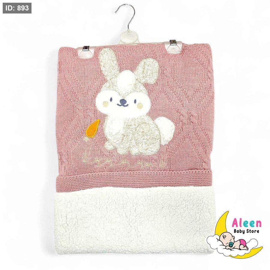 الخامة: صوف ناعم من الخارج منقوش برسمة أرنب لطيف، مبطن من الداخل فرو طري وناعم يمنح البيبي راحة ودفا مثالي.