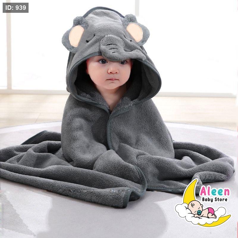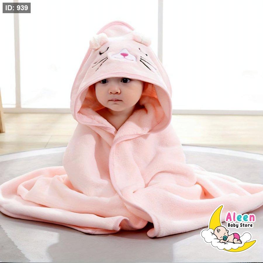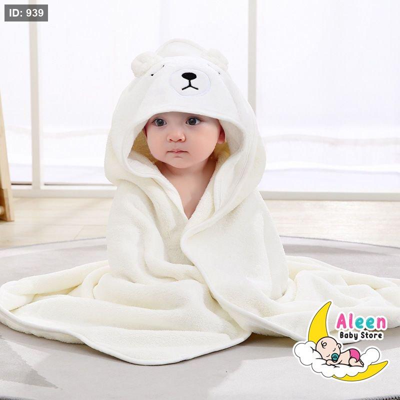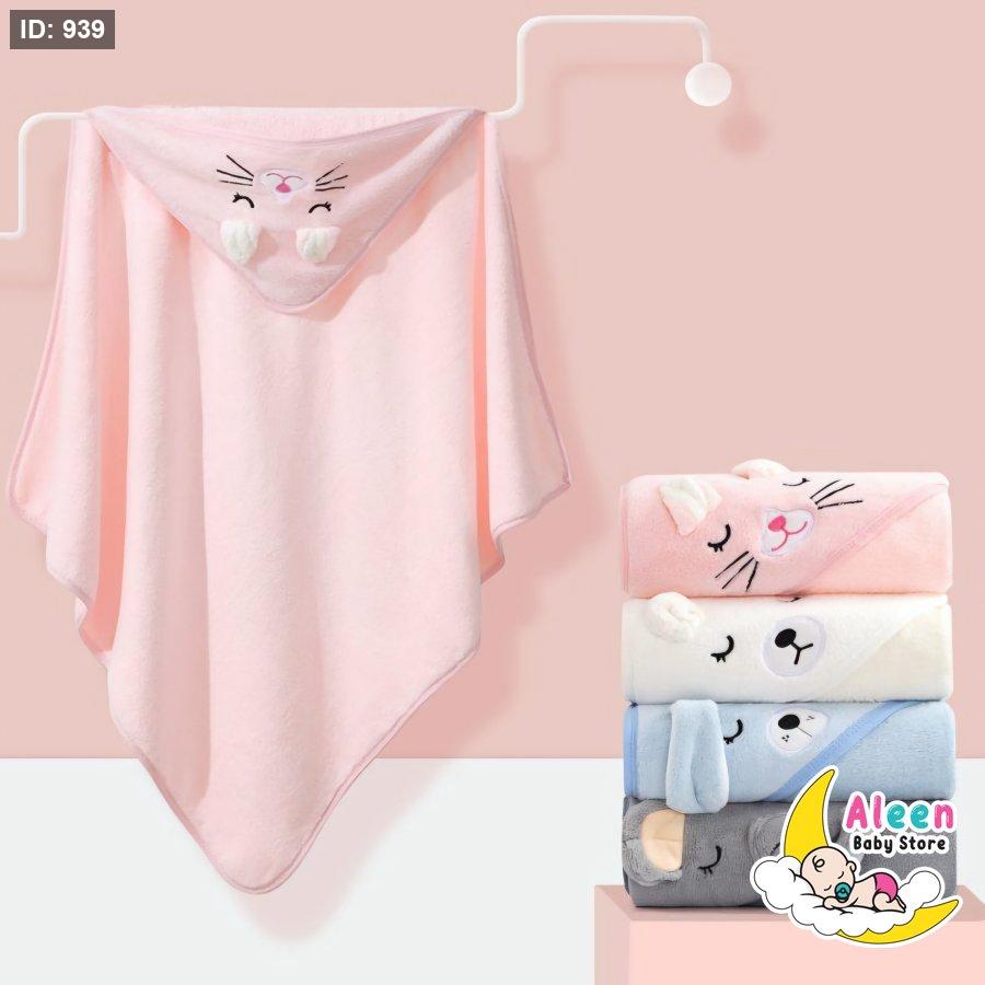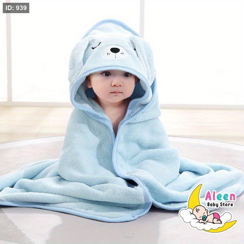 منشفة ناعمة وعملية بغطاء رأس (هودي) بتصاميم حيوانات لطيفة، مصنوعة من خامة ماصة وناعمة على بشرة الطفل، مثالية بعد الاستحمام أو السباحة للحفاظ على الدفء وتجفيف سريع ومريح.